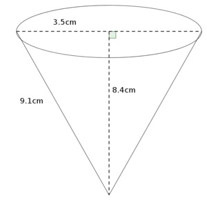 Jared is scheduled for some tests at his doctorâs office tomorrow. His doctor has instructed him to drink 3 liters of water today to clear out his system before the tests. Jared forgot to bring his water bottle to work and was left in the unfortunate position of having to use the annoying paper cone cups that are provided by the water dispenser at his workplace. He measures one of these cones and finds it to have a diameter of 7cm and a slant height (measured from the bottom vertex of the cup to any point on the opening) of 9.1cm.